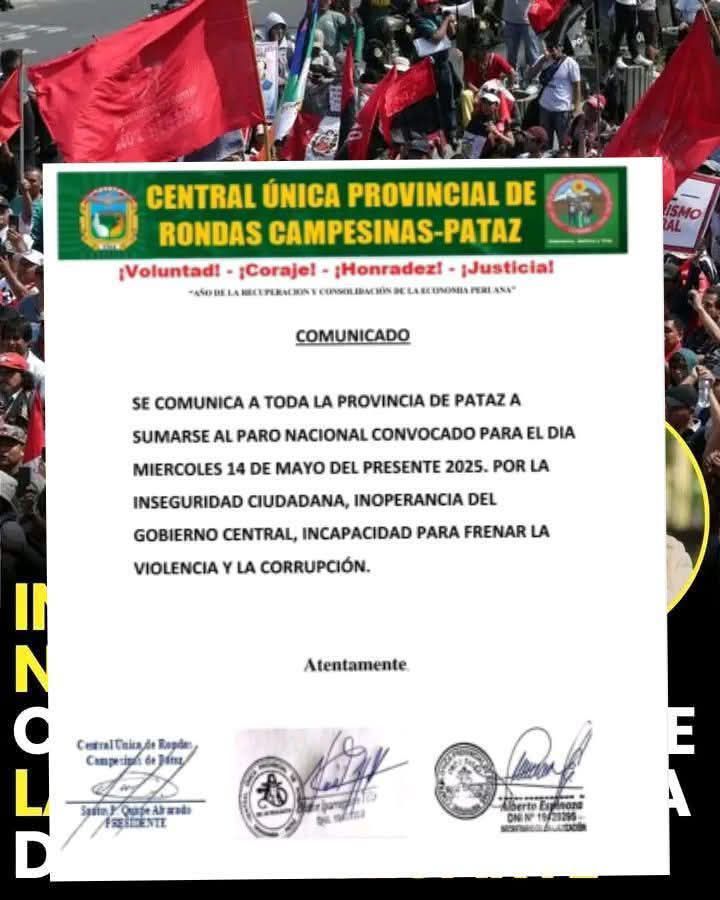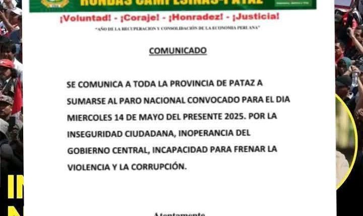La Central Única de Rondas Campesinas de la provincia de Pataz a través de un comunicado hacen conocer que se unirán al PARO NACIONAL convocado para este miércoles 14 de mayo