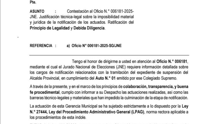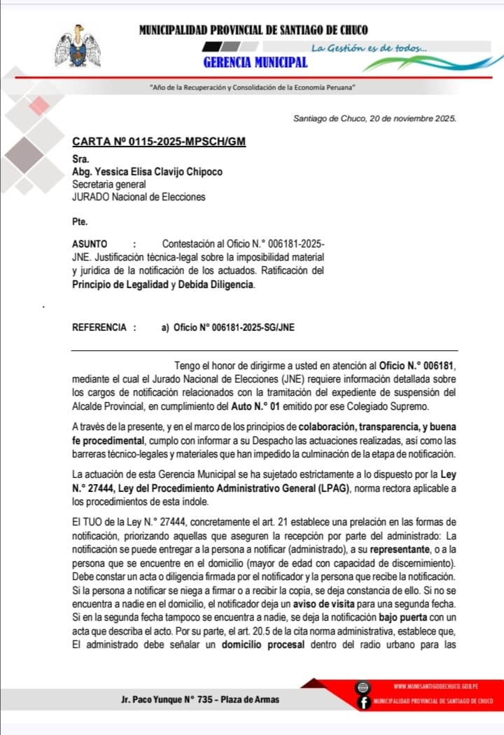 La gerencia municipal de la Municipalidad Provincial de Santiago de Chuco emitío contestación técnica a oficio del Jurado Nacional de Elecciones la misma que consideramos una burla para la inteligencia de todos los Santiaguinos.